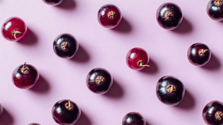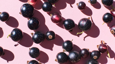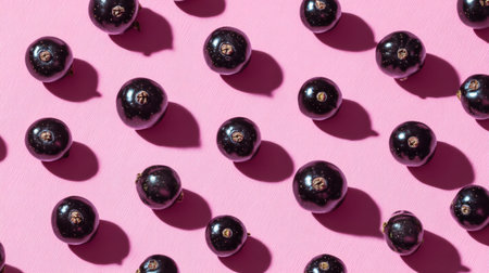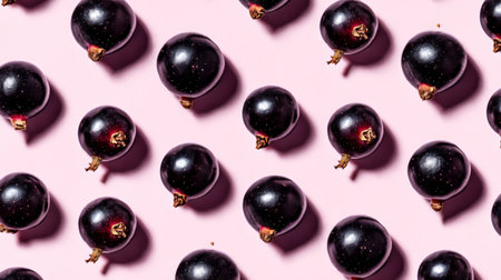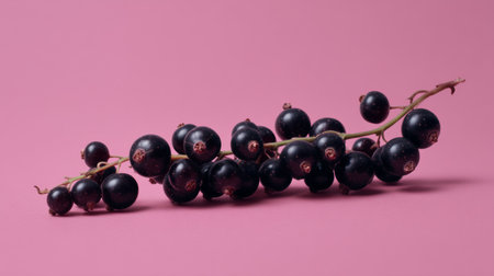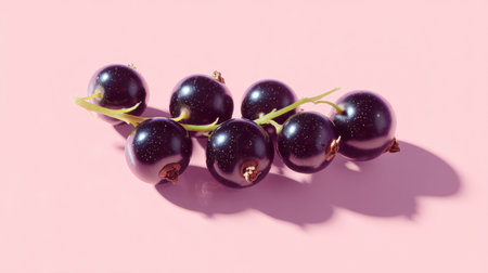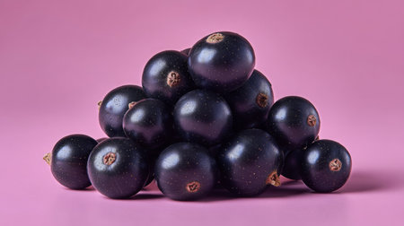 A visually appealing arrangement of fresh black currants on a soft pink background. Perfect for health and culinary themes, showcasing vibrant colors and textures.