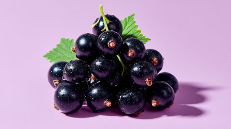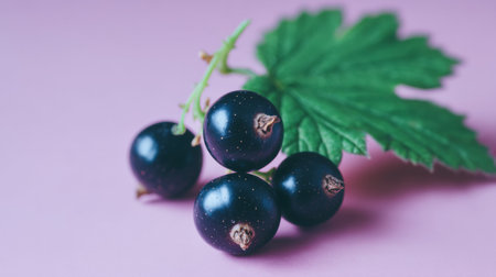 A visually appealing arrangement of fresh black currants with green leaves on a soft purple backdrop. Perfect for showcasing healthy eating, vibrant flavors, and natural cooking.