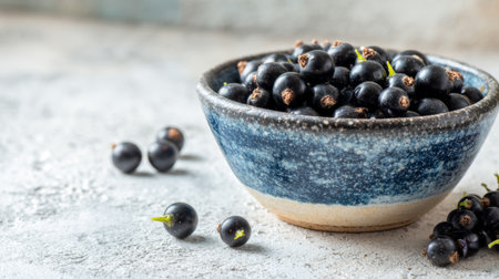A captivating image of fresh black currants in a decorative bowl resting on a rustic surface, ideal for use in culinary and food-related projects to showcase freshness.