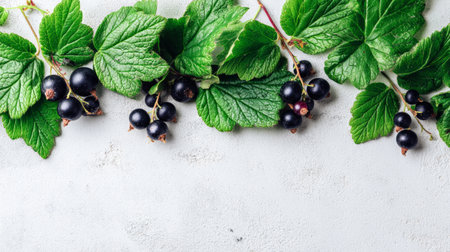 Stunning composition featuring fresh blackcurrant berries and vibrant green leaves against a light stone background, perfect for culinary uses and healthy cuisine inspiration.
