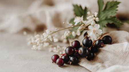 A beautiful composition featuring fresh blackcurrants and redcurrants intertwined with delicate flowers on a soft fabric background, perfect for seasonal themes and culinary presentations.