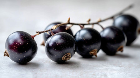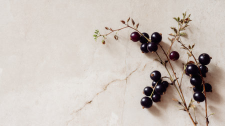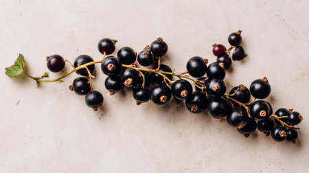 A beautiful arrangement of fresh blackcurrant berries and branch on a neutral stone surface, perfect for culinary or healthy lifestyle themed images. Ideal for food photography.