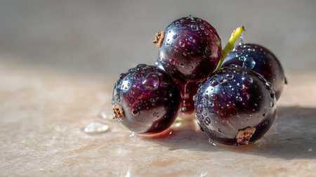 Close-up of fresh blackcurrants featuring glistening water droplets. This image captures the natural beauty and vibrant colors of these berries, perfect for health and culinary uses.