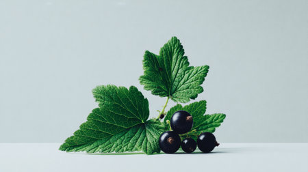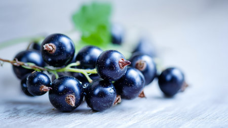 A stunning image of fresh blackcurrants displayed with green leaves against a light gray background. Ideal for healthy food content, recipes, and culinary inspiration.