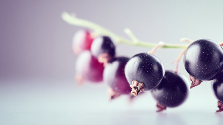 This image showcases a stunning close-up of black currants on a branch, emphasizing their glossy texture against a soft gradient background, perfect for food-related themes.