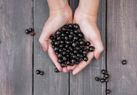 Handful of fresh black currants in woman's hands on brown rustic wood background. Harvest of healthy food concept. Natural ripe organic berries on wooden table, top view.