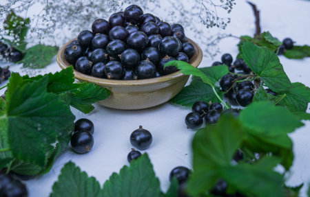 Beautiful arrangement of fresh black currant berries nestled among vibrant green leaves on a light surface, symbolizing freshness, health, and natural beauty.