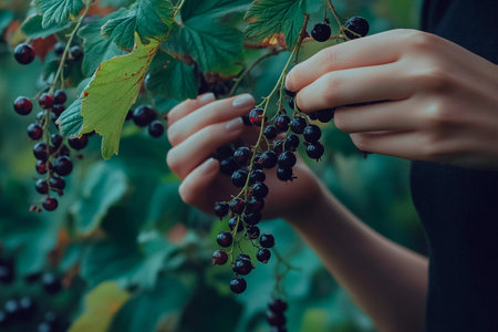 Hands gently pluck ripe blackcurrants from lush green branches in a sunlit farm setting during late summer. The scene captures the joy of berry picking.