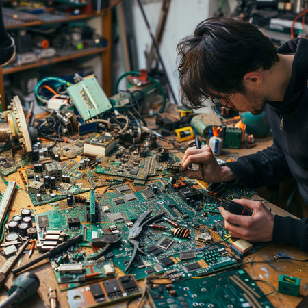 electronic recycle. gadgets repair. technician or engineer soldering used or broken motherboard.