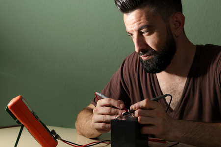 Electrician working with multimeter, checking board circuit, closeup of male hands. Electrician repairing electronic components.