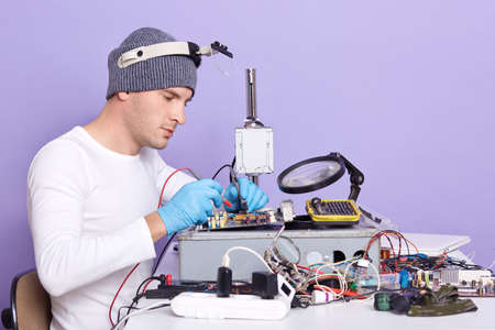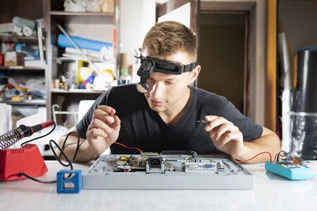 Engineer fixing broken computer equipment. Electronic repair shop, technology development concept