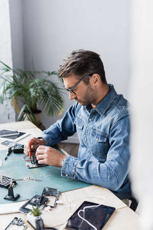 Side view of focused repairman holding sensors of multimeter on disassembled part of mobile phone on blurred background