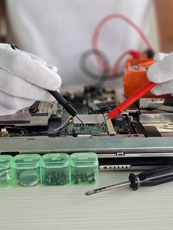 Technician repairing laptop motherboard with tools and multimeter in well-lit workspace