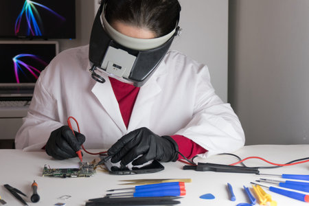 Repairing Hardware Equipment. Repair Shop and Worker with Tools. Microchip and Circuit Board. Testing Modern Digital Device on Desk . Electronic Devices Concept.