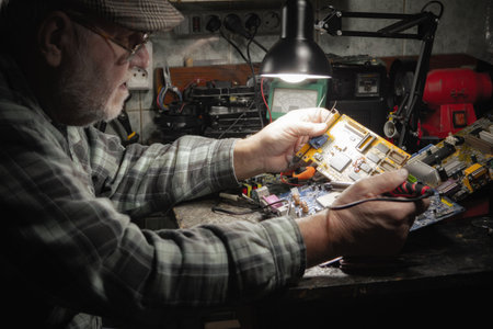 Repairman repairing electronic circuit board with soldering iron in workshop