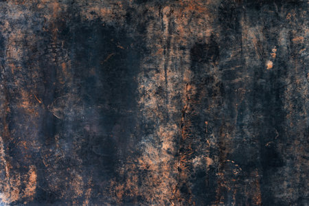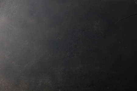 Old black color painted concrete with black scuffed rustic background and rust, horizontal orientation, top view. Copy space
