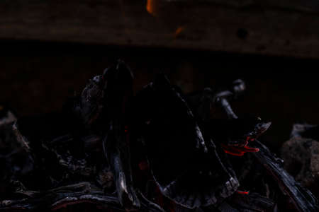 burn out black logs and coals during a campfire, closeup in nature.