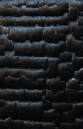 Burnt wooden texture background. Rough black wood surface caused by burning fire. Dark material made from coal or charcoal.