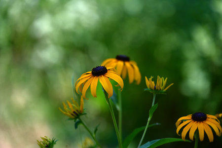 Vibrant yellow rudbeckia flowers with dark centers bloom in a garden. A detailed close-up of a joyful summer scene, with a blurred green background, capturing natural beauty and warmth