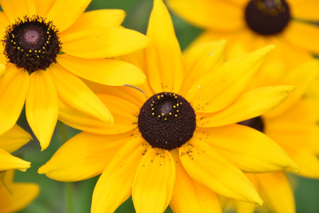 Golden-yellow black-eyed flowers of Susanna or rudbeckia close-up