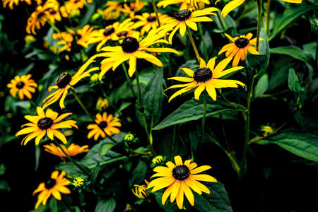 Black-eyed Susan plants in flowering season. Rudbeckia hirta yellow flowers in a summer garden