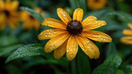 Black eyed Susan in gentle light rain, soft raindrops visible on vivid green leaves, natural realistic style, bright fresh colors, balanced wide composition, cinematic framing, highly detailed, seamless for video continuation.