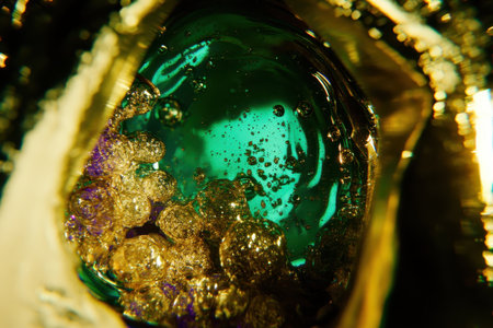 Golden sugar spheres dissolve inside vibrant green soda bubble. AI-generated.