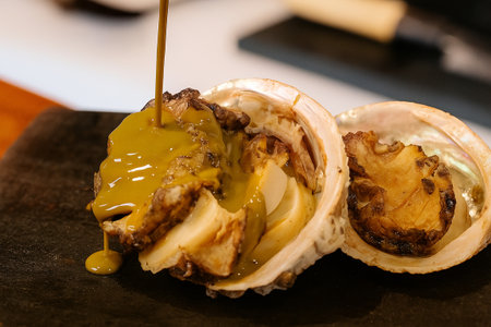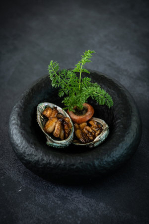 Cooked Abalone Dish, Scallops in Luxury Restaurant, Cooked Seashells, Australian Abalone in Sauce with Greens, Generative AI Illustration