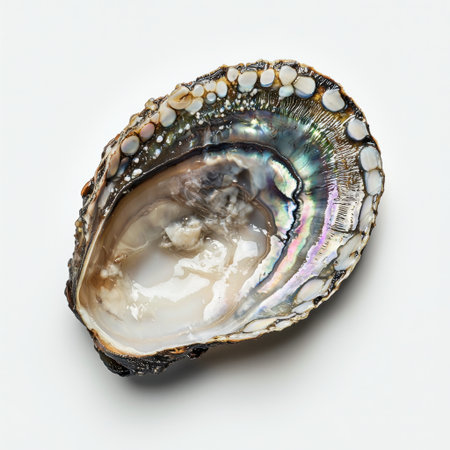 Close up of an opened oyster shell revealing its shimmering, iridescent nacre with a spectrum of vibrant colors. natural beauty and delicate texture.