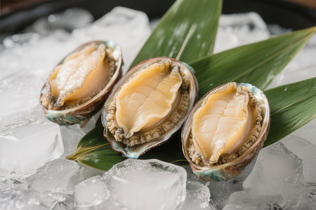Close up of raw abalone stacked in layers on a wooden table, showing detailed textures of the shell and flesh in natural light