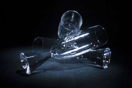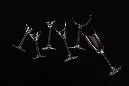 Top view of various dirty and with lime dots drinking glasses laid down on sides in black matte background