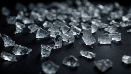 Shattered Glass Fragments on Dark Surface - Abstract Broken Glass Pieces in Motion