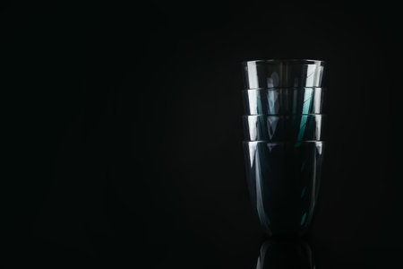 Glass for drinks on a black background. Transparent empty glass on reflection surface.