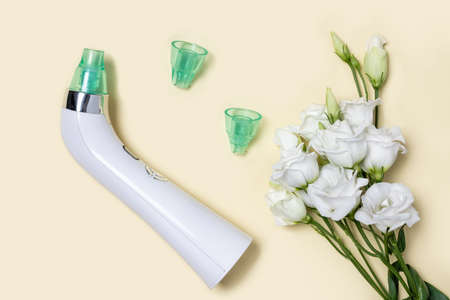 Blackhead vacuum remover or pore cleaner is home beauty and skin care device for facial cleaning. Tender white flowers Eustoma on pastel yellow background
