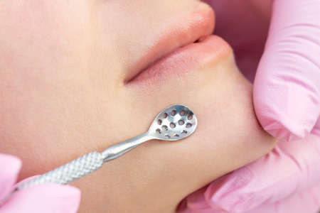 Procedure for cleaning the skin of the face with a steel appliance with a spoon from blackheads and acne.