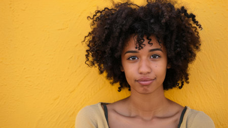 A woman with a bold hairstyle poses against a vibrant yellow and black zebra-striped wall