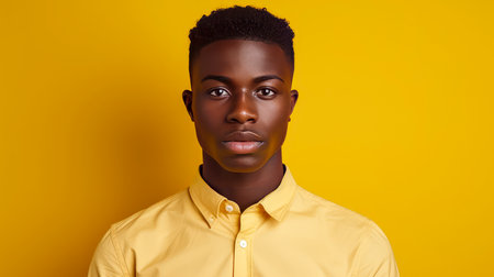 Portrait of a happy cheerful serious, troubled African American teenager guy with perfect skin, yellow background, banner. Advertising of teenage cosmetics, hair care products, medicines, perfumes, cosmetology, courses, college schools and trainings