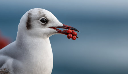 Seagull with striking white feathers and dark accents holds vibrant red berries in its beak, set against a serene blue ocean backdrop, highlighting wildlife interaction
