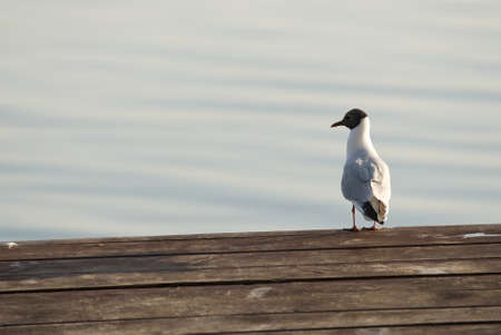 One seagull sits on a old sea pier. The European herring gull, Larus argentatus