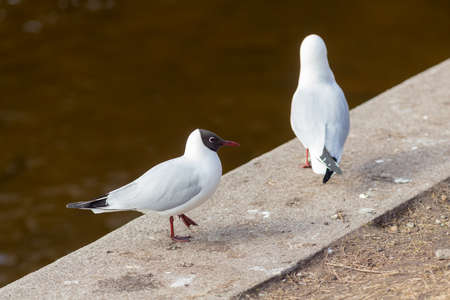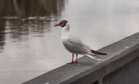 Seagull standing on a concrete near a lake