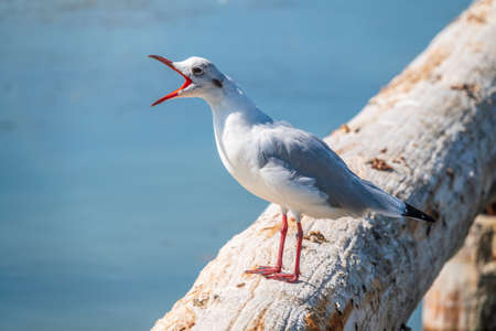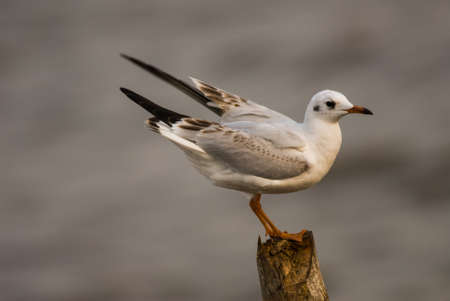 Black-headed Gull or Chroicocephalus ridibundus sitting on dry wood at river close-up portrait, selective focus, shallow DOF.