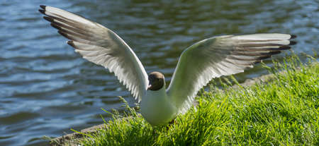Black-headed Gull (Larus ridibundus) in flight on the green grass background. A flying seagull, looks a bit like an angel.
