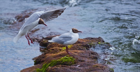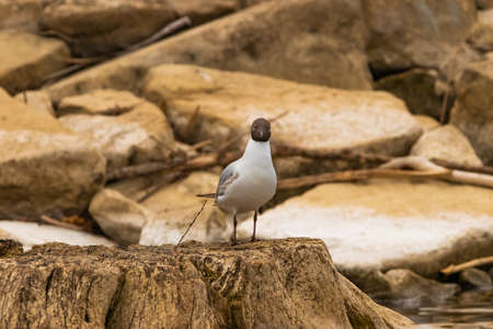 Black-headed Gull (Chroicocephalus ridibundus) sitting on a rock in the river.