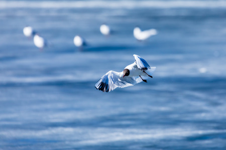Seagull flies on the background of the water surface. The concept of freedom and overcoming space