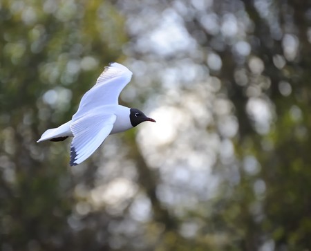 A black-headed gull in flight, with a tree hinted in the background