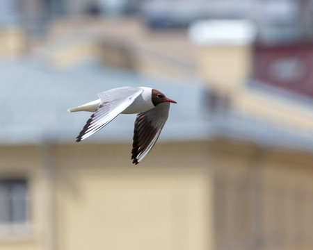 Seagull in flight against the background of the city .