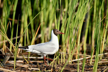 Black-headed gull (Larus ridibundus) with chick in the nest