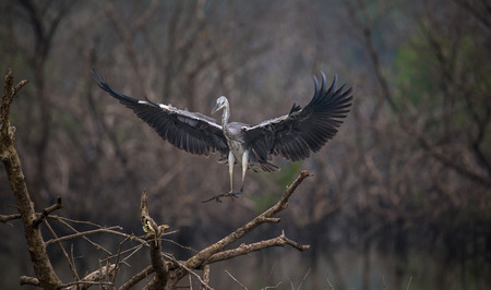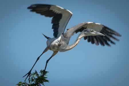 Grey Heron bird about to land on a tree in a river