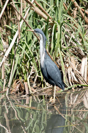 the pied heron is in the reeds in the pond