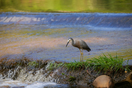 White faced heron on rapids in Shoalheven River patiently waiting for prey to feed on.